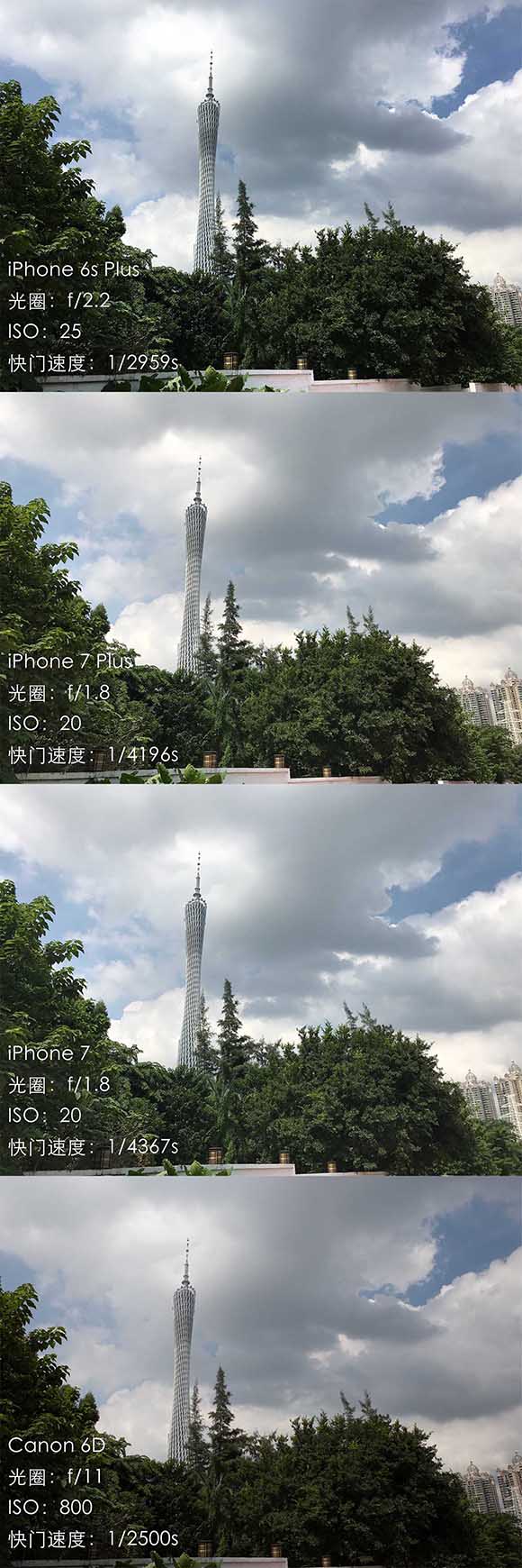 第一组样片中,iPhone 6s Plus 那张大部分只能看到树叶的轮廓,而 iPhone 7 和 7 Plus 则能保留更多细节。参考佳能 6D 的出片,iPhone 7/7 Plus 的白平衡也比 iPhone 6s Plus 的更准确, 更接近肉眼所见的效果. 不过, iPhone 6s Plus 的色彩更鲜艳, 更讨眼球喜欢。