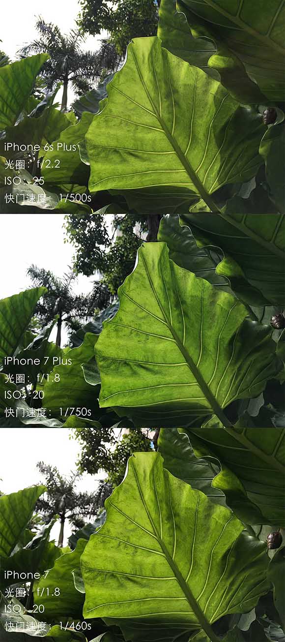 第二组样片。从绿叶的纹理可以看出,iPhone 7 Plus 的解析力、成像反差会比 iPhone 6s Plus 高出半档以上。更大的光圈,使得 iPhone 7 Plus 能有效地压缩曝光时间,减轻手抖对成像的影响。这对于习惯用手机来拍静物的用户,也算是个好消息。