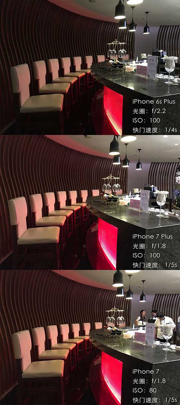 得益于更大光圈和光学防抖,iPhone 7 在暗光条件的成像中显示出了相当的优势。在下面这组样片对比中,iPhone 6s Plus 吧台背景已经接近黑色,而 iPhone 7 和 7 Plus 依然能够看清背景的曲线,值得一提的是,iPhone 7 的表现与 7 Plus 相当。