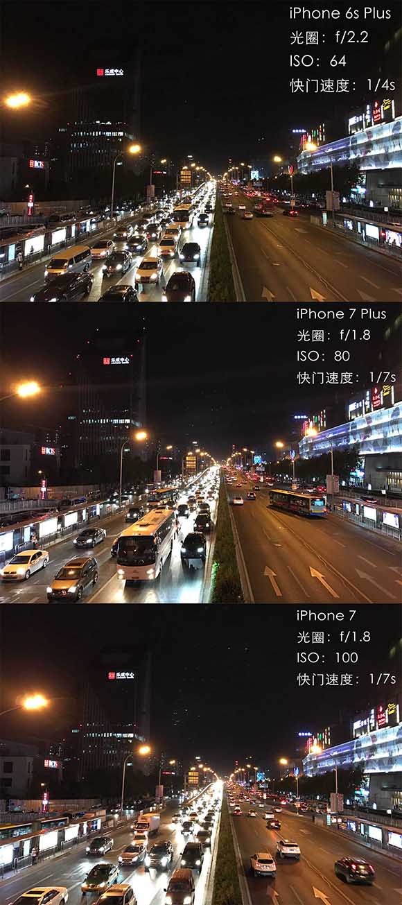 在光线复杂的夜景对比中,iPhone 7 Plus 保留的暗部细节会比 iPhone 6s Plus 要多,这可以从画面远处的大楼看出来。另外,iPhone 6s Plus 拍到的绿化带已经遭到严重涂抹,而 iPhone 7/7 Plus 还能够保留叶子的轮廓。