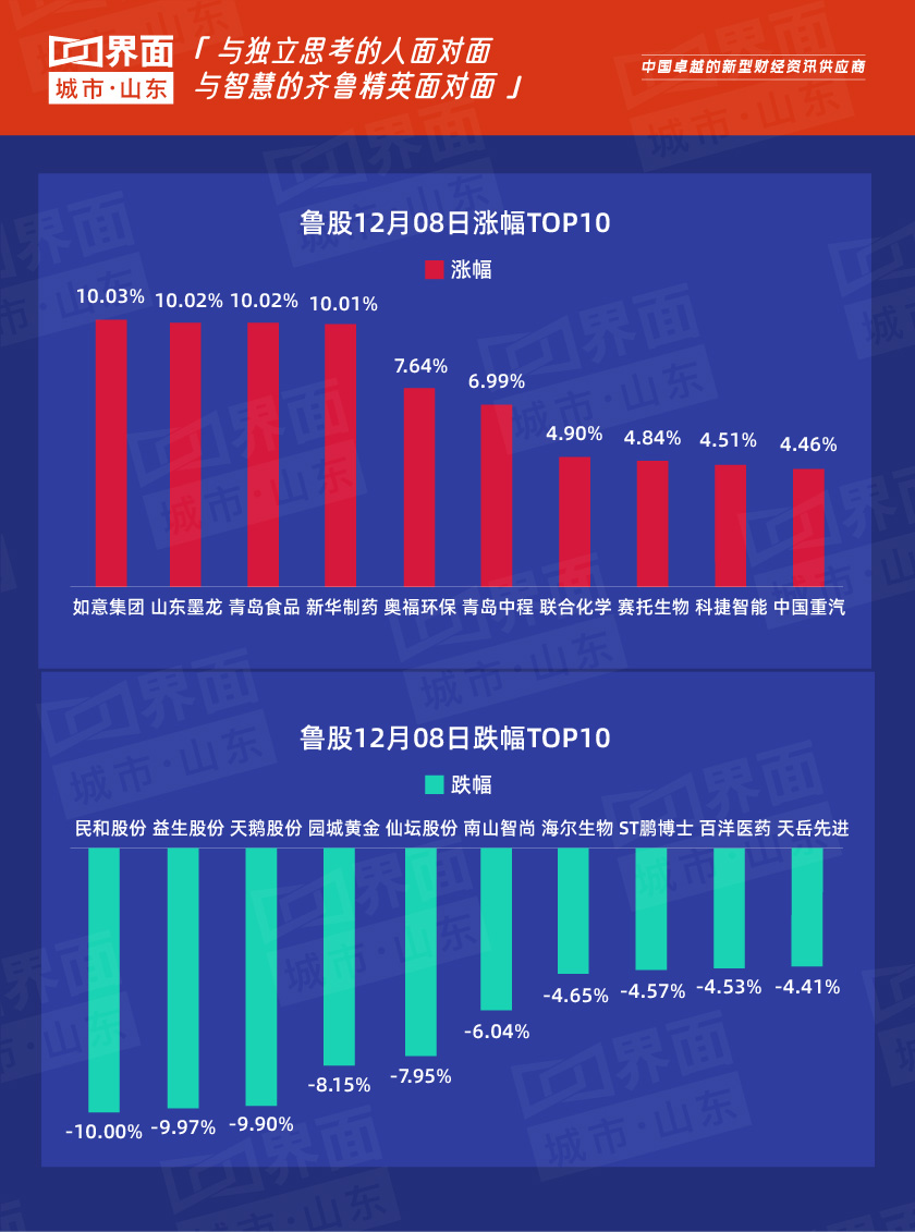 12月8日,山东省内沪深京股票有100只个股上涨,182只个股下跌;