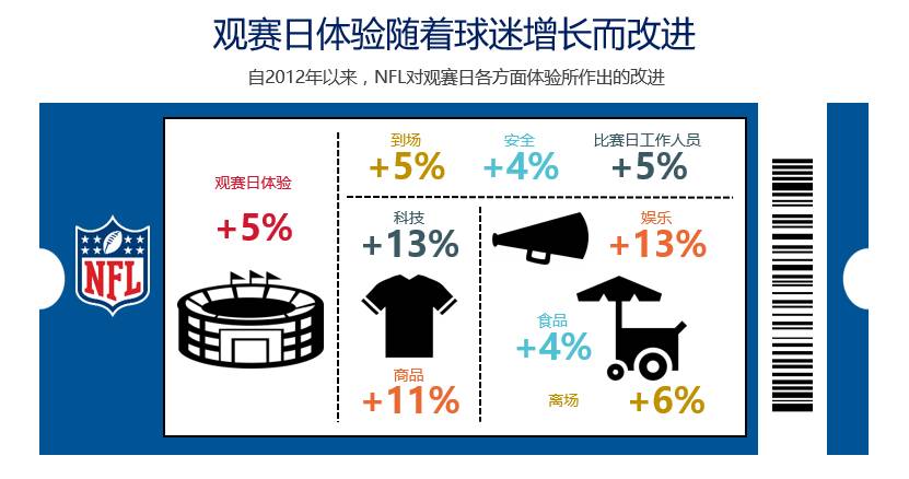 同时,NFL一直力图为球迷创造更好的观赛体验,不断提升比赛日的服务质量。自2012年以来,NFL赛事现场服务人员人数增加了5%,安保力量增加了4%,娱乐体验内容增加了12%,科技元素应用增加了13%。球迷不是单纯来欣赏一场精彩的比赛,同时也是享受一次盛大的美式橄榄球合家欢派对——壮年球迷可以享受比赛,老年球迷无需顾虑安全问题,少年儿童可以参与更多的美式橄榄球文化体验。