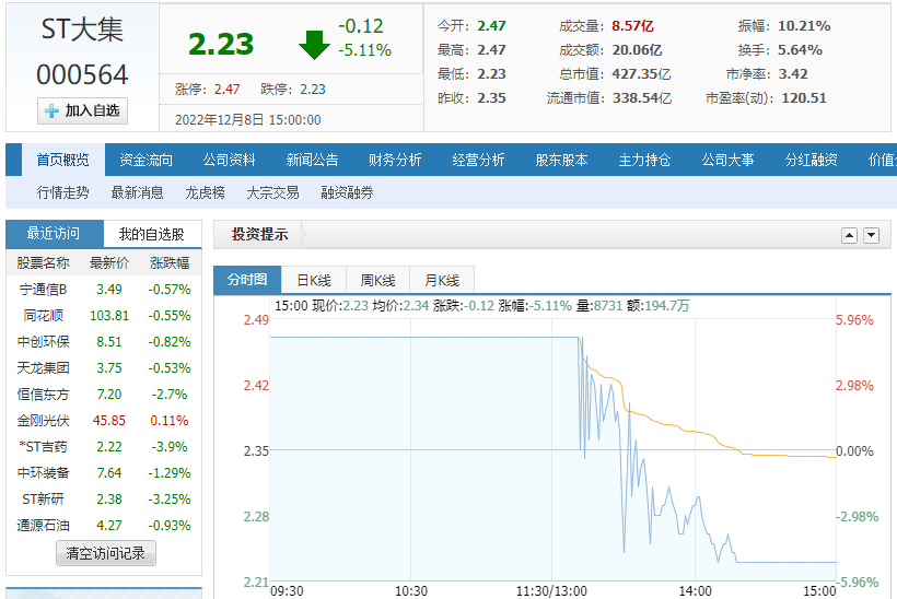 12月8日,所属供销社板块走低,当日复牌的ST大集(000564.SZ)一字涨停开盘,午间收盘时有102.2万手封单封死涨停,按早盘收盘价价估算,约合2.5亿元资金参与封板。然而,午后开盘不久该股打开涨停并迅速下挫,14点18分左右封死跌停板,至收盘有97.3万手封单按死在跌停板上,按收盘价2.23元/股计算,约合2.2亿元资金。