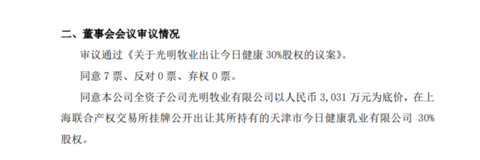 近日,光明乳业(600597.SH)发布《关于光明牧业出让今日健康30%股权的议案》公告,宣布折价出售联营公司部分股权。公告显示,光明乳业全资子公司光明牧业有限公司以3031万元为底价,在上海联合产权交易所挂牌公开出让其所持有的天津市今日健康乳业有限公司30%股权。