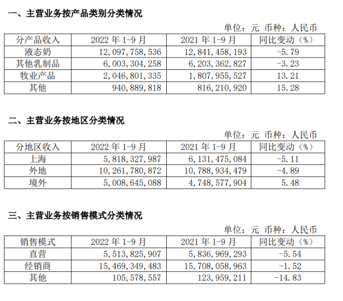 三季度财报显示,2022年1-9月,光明液态奶板块收入约120.98亿元,同比下降5.79%;其他乳制品收入60.03亿元,同比下降3.23%;只有牧业产品收入20.47亿元,同比增长13.21%。