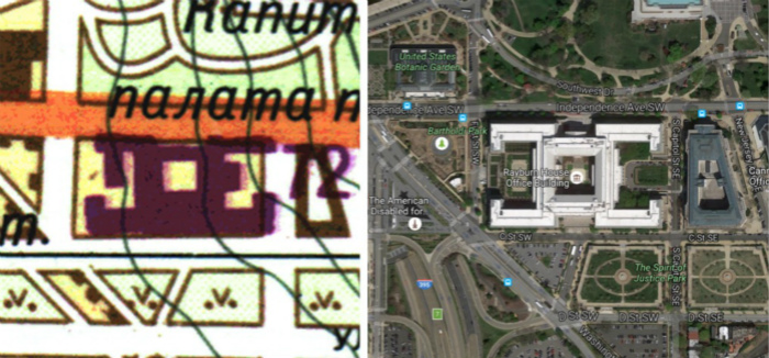另一个有趣的例子是国会山上的雷伯恩众议院大厦(Rayburn House Office Building)。这栋大楼原本真实的外形设计就已足够奇怪,而苏制地图上呈现的布局更加扭曲。莫尔斯认为,这可能是“航拍照片或卫星图片在传输过程中出现失真”的结果。“这样的工作连续每天做8到10个小时,你肯定头昏眼花。”