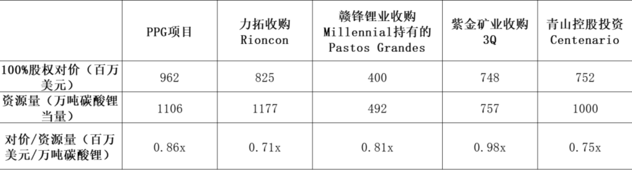 根据最近一些锂矿并购交易估值,平均每万吨碳酸锂交易对价为0.822百万美元,28万吨碳酸锂对应约23百万美元,约合人民币1.6亿元。