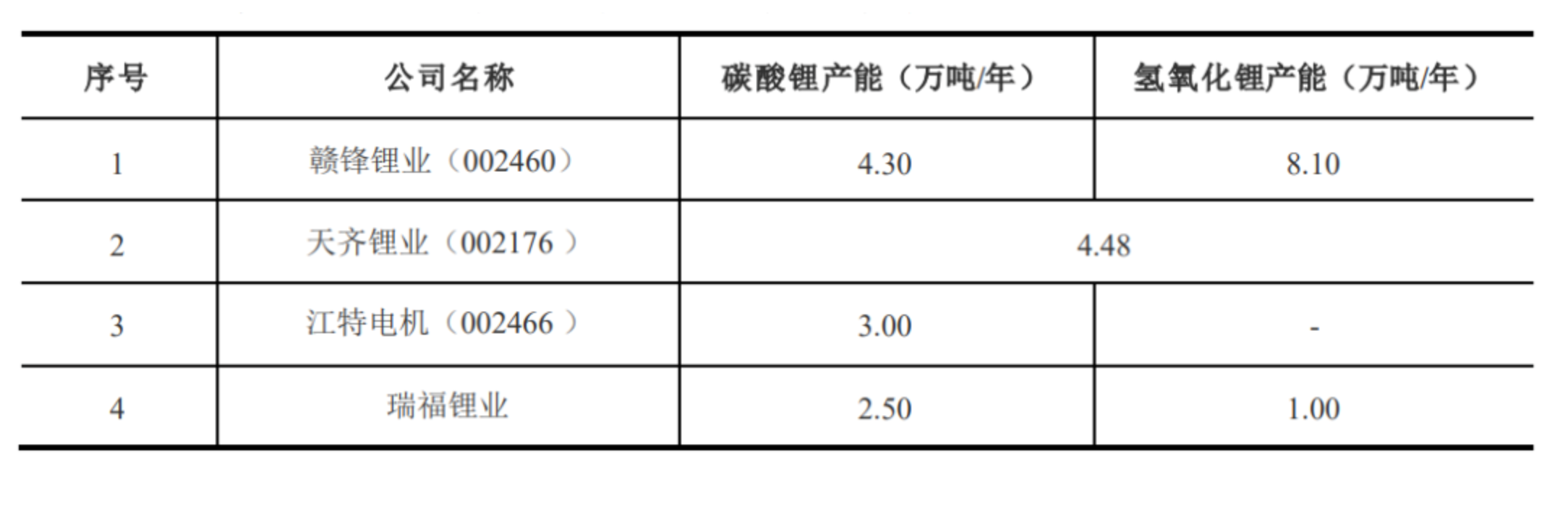 根据中国有色金属工业协会锂业分会发布的《2021年我国锂产品产量统计数据》,2021年我国碳酸锂产能约50万吨,氢氧化锂产能约26万吨,瑞福锂业已建成的碳酸锂产能占全国产能约5%,氢氧化锂产能占全国产能约3.85%。与瑞福锂业规模接近的锂盐产品生产企业的产能数据如下:
