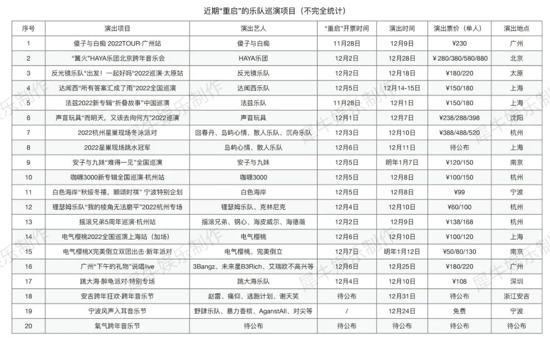 这类演出因运作成本较低、观众规模较小,能比较迅速地在政策转弯时回过神来。可以看到,在上海、北京、杭州、南京等全国多个城市,各类乐队巡演正雨后春笋般地回归。