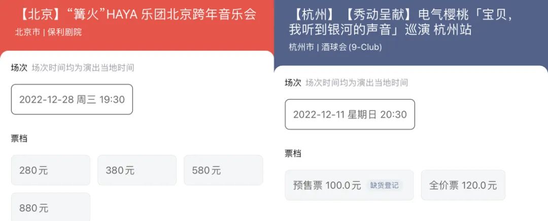 从这轮演出票价来看,有无参加乐夏的乐队差距比较明显。像HAYA乐团、声音玩具的巡演票价卖到了¥280/380/580/880和¥388/488/520,票价分档直追头部明星演唱会。而像锂瑟姆乐队、电气樱桃这种大众认知不高的乐队演出,¥50、¥100左右的入场票对学生党颇为友好。