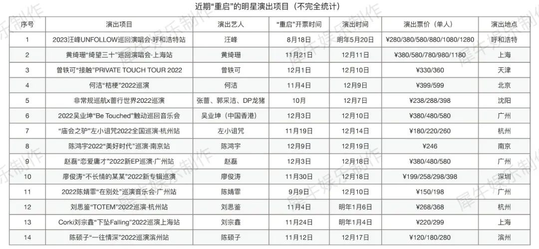这轮复工潮还出现了偶像艺人的巡演项目,从《创造营2019》成功出道的赵磊最近将在广州、南京开启他“恋爱庸才”主题的新EP巡演,而另一档秀综《明日之子》捧出的原创歌手廖俊涛,则将在深圳开启他“不长情的某某”2022新专辑巡演。