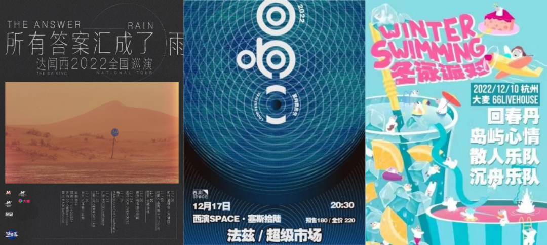 还有些乐队选择了小型的拼盘演出来“复工”,在《乐夏2》强势杀入20强的岛屿心情近日与国内高人气的散人乐队、回春丹等开启了两场演出,分别是10号在杭州进行的冬泳派对和11号在上海举办的跳水冠军演出。