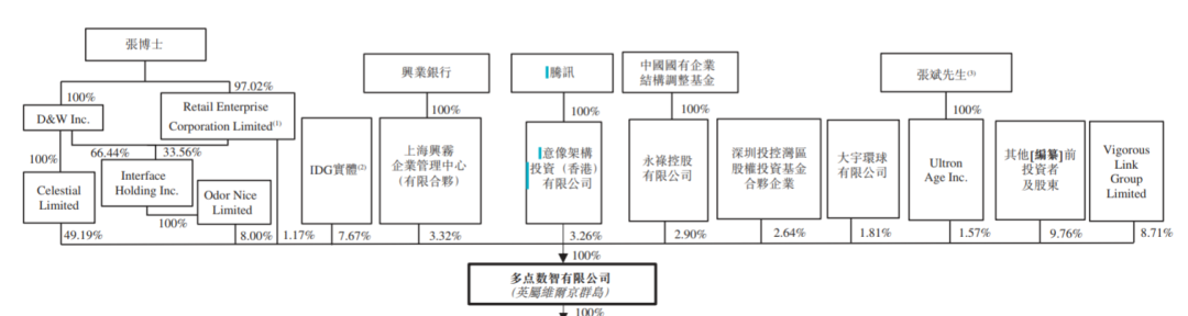 多点先后引入了IDG资本、腾讯、兴业银行等投资方,累计融资约7亿美元。最后一轮融资后估值约30.5亿美元。招股书显示,张文中及弟弟张斌持有多点59.93%股权,员工持股平台Vigorous Link持股8.71%,IDG资本持股7.67%,兴业银行持股3.32%,腾讯持股3.26%。