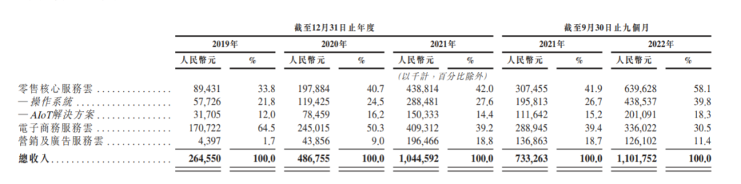 多点主要收入来源包括零售服务云、电商服务云和营销广告服务云。多点以Dmall OS为主的零售服务云这两年发展迅速,从2020年不到两亿已增至2022年前9个月的6.4亿元,超越电商服务云成为多点最主要的收入来源,最新收入占比接近60%。
