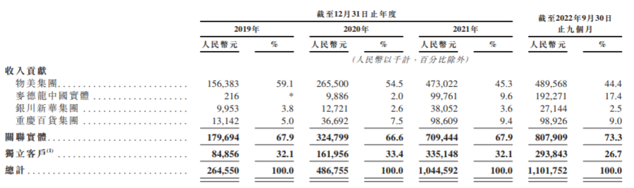 值得注意的是,尽管多点声称目前已拥有458家客户,但其主要还是为物美系企业服务。它的主要客户包括物美集团、麦德龙中国、重庆百货、银川新华等,均为物美关联企业实体,这些关联实体在2022年前9个月贡献的收入占比高达73.3%。