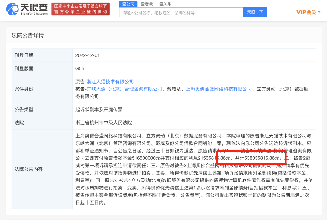 12月1日,ofo小黄车的运营主体及其创始人戴威,被浙江天猫技术有限公司告上法庭,法院公告显示,天猫要求ofo偿还借款本金及利息共5.38亿元。而从多方消息来看,这笔超5亿元的债务,恐怕很难收回了。
