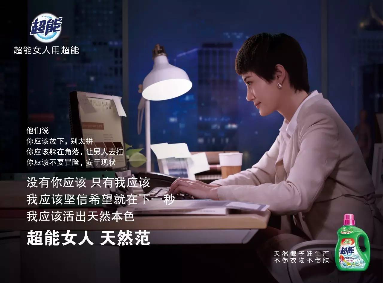 超能洗衣液已经不仅仅从功能需求解决女性痛点,它更像一种精神,就如同那就广告语“超能女人用超能!”