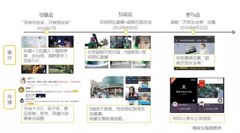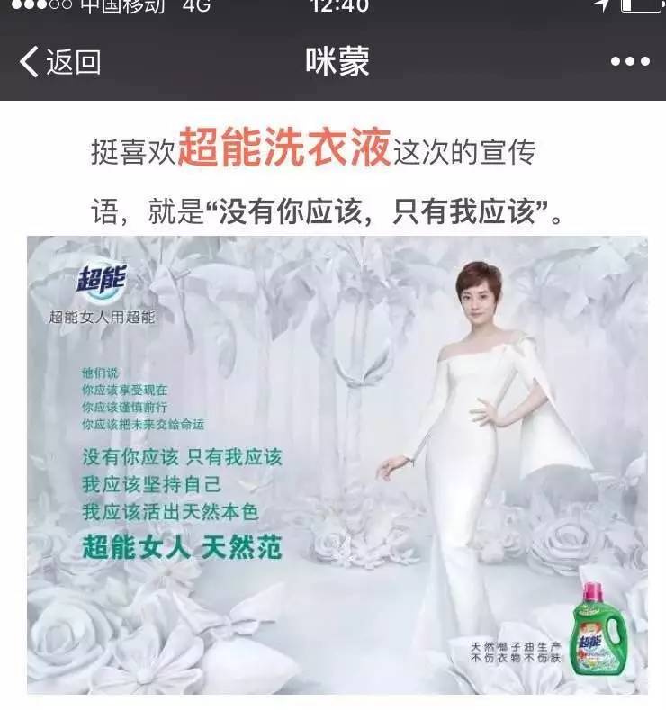 从“引爆点、互动点、参与点”三个方面看超能洗衣液此次整合营销传播中,通过明星代言、TVC投放,到线下场景互动、网红直播、短视频、自媒体大V、段子手等创意活动、强势资源等整合投入,让我们不仅参与到“超能女人天然范”活动中来,同时切实被那句“没有你应该,只有我应该”打动。