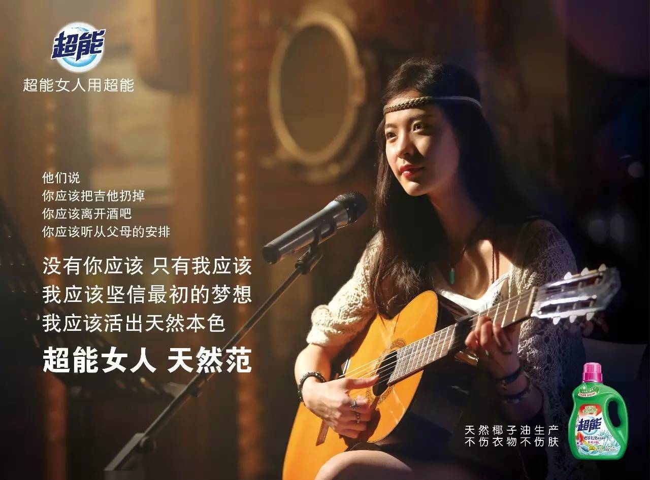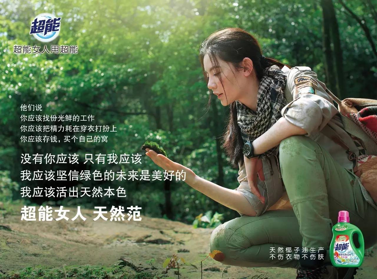 最近超能洗衣液推出新的TVC广告,其主打“没有你应该,只有我应该”的口号,极具感染力,其中以孙俪领衔,植物学家、歌手、创业者的四个不同角色的女性,把这句话演绎成了自己人生的追求,很励志,也很有激情,其中的“超能”一词也赋予了不同的意义,“天然范”一语双关了产品的天然工艺,同时也在表达女性的天然魅力。