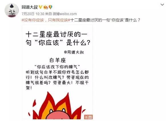 在选取意见领袖时,传播内容与其自身特点相结合,比如苏岑就从情感专家角度发表“靠山会到,靠男人会跑,靠自己最好”的观点,同道大叔则从星座的角度:十二星座最讨厌的“你应该”是什么?