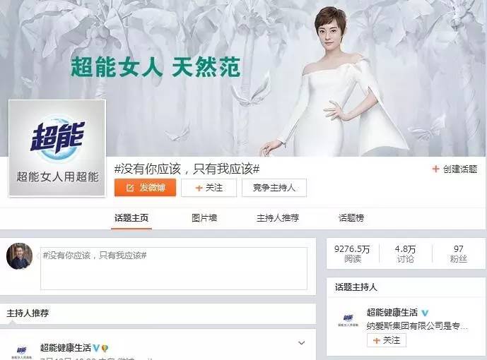 超能品牌通过孙俪+3个素人的TVC广告,传递出“没有你应该,只有我应该”的品牌记忆点,再通过众多行业意见领袖的集中扩散,形成话题效应,将用户的情感与品牌的价值诉求快速相连。
