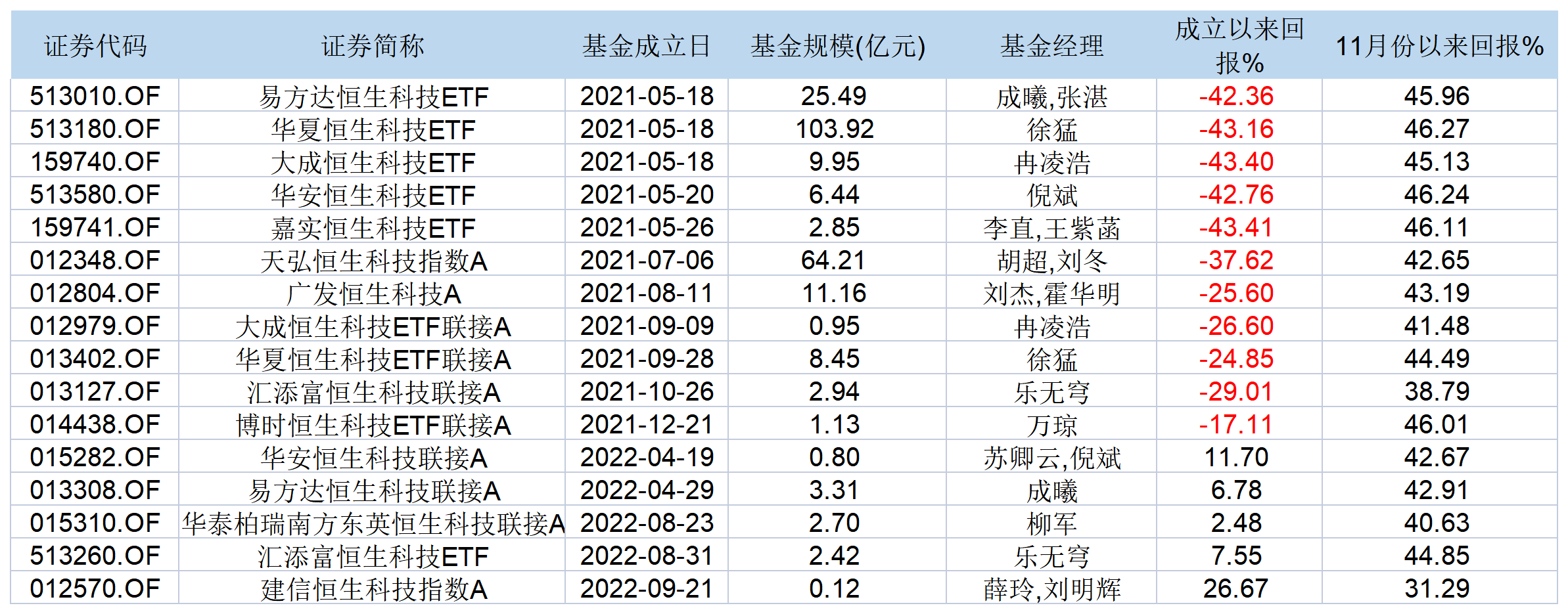 界面新闻记者统计发现,目前市面上跟踪恒生科技指数的基金共有约20只,由于成立时间的不同,成立至今的业绩也不相同。以去年5月份成立的首批恒生科技ETF为例,11月份以来的净值涨幅均超过了40%。不过,由于此前的跌幅较大,这批恒生科技ETF成立至今的浮亏仍在-40%以上。