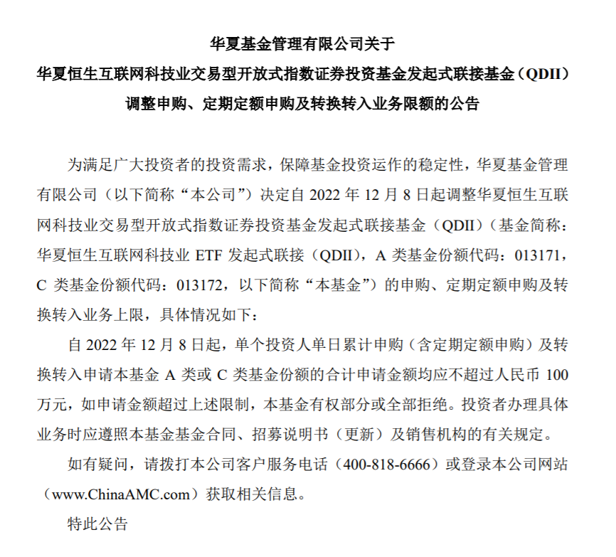 连续上涨的态势已经吸引了大量资金蜂拥而入。12月8日,华夏基金公告,称为了保障基金投资运作的稳定性,决定对华夏恒生科技ETF联接基金的限购额度进行调整,单账户单日的申购额度从此前10月19日的1万元放宽至100万元。