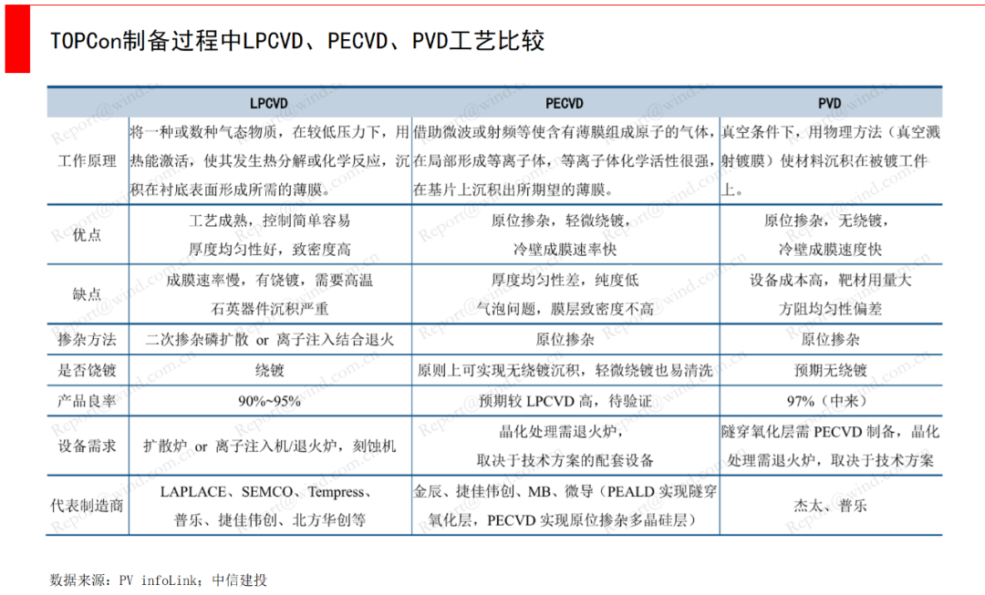 其中,TOPCon制备工艺中最核心的环节是多晶硅的沉积,新增的核心设备也就是 LPCVD(低压化学气相沉积)、PECVD(等离子体化学气相沉积)设备以及镀膜设备环节。目前最成熟的方案为LPCVD路线,通过热氧法生长隧穿氧化层,通过LPCVD沉积多晶硅层,随后进行磷扩散。