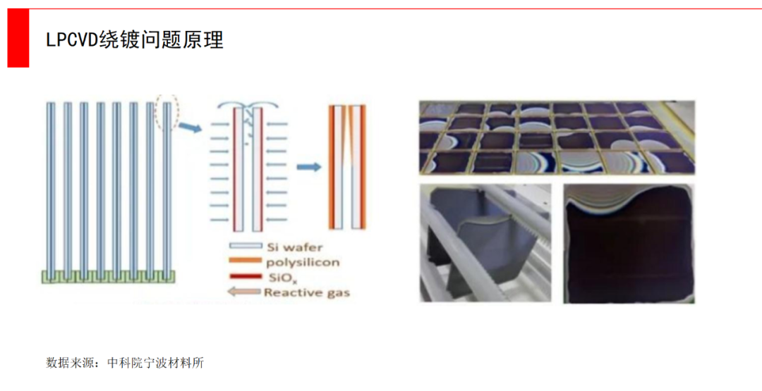 不过LPCVD镀膜均匀性好,致密度高,但是效率上没有优势,同时绕镀问题也是其主要制约之一。绕镀的主要原因是,TOPCon用到大量石英管式的设备,这是沿着PERC技术路线发展而来的,通常称为热壁式CVD,整个石英管在工作的时候都是被加热的,它会带来绕镀(绕扩)问题,就是会产生绕到背面镀上一层膜,或者绕到背面产生扩散等等问题。