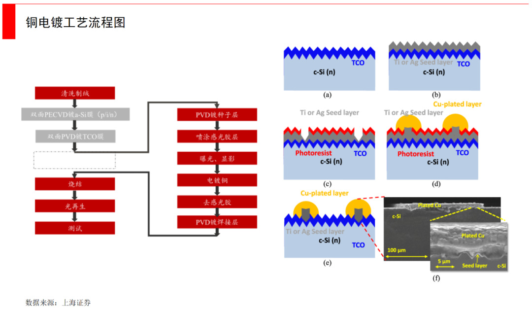 铜电镀是一种非接触式的电极金属化技术,在基体金属表面通过电解方法沉积金属铜制作铜栅线,收集光伏效应产生的载流子。铜电镀可以取代银浆,同时缩短线宽、增加光照面积,提高转换效率。电镀铜能把成本下降至0.07-0.08分/W,相比银浆下降一大半。