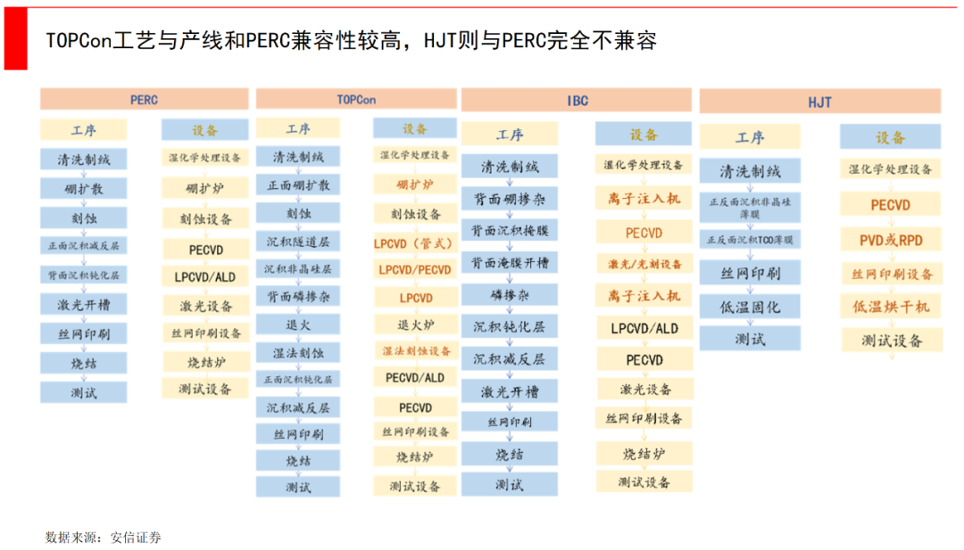 PERC、TOPCon核心的制结工艺,均属于600℃以上的高温工艺体系,而HJT是采用200℃以下低温超薄薄膜工艺,这是制备上的核心区别。
