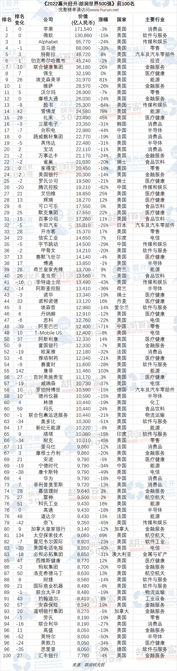 12月9日,胡润研究院联合嘉兴市人民政府、嘉兴经济技术开发区发布《2022嘉兴经开·胡润世界500强》。2022年,胡润世界500强企业总价值下降80万亿元,同比去年下降19%。其中,汽车公司在2022年受限于包括但不限于芯片短缺和疫情的影响,整体表现不佳,总价值下降了21%。