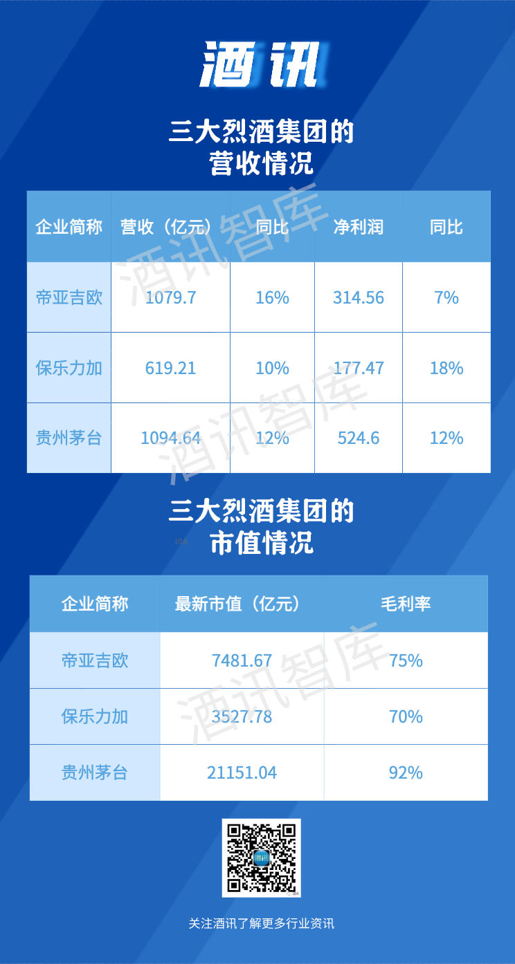从规模上来看,贵州茅台、帝亚吉欧、保乐力加的年营收规模分别为1094.64亿元、1079.7亿元、619.21亿元,贵州茅台和帝亚吉欧规模相当,保乐力加的营收规模与中国第二大白酒集团五粮液(662.09亿元)相当。