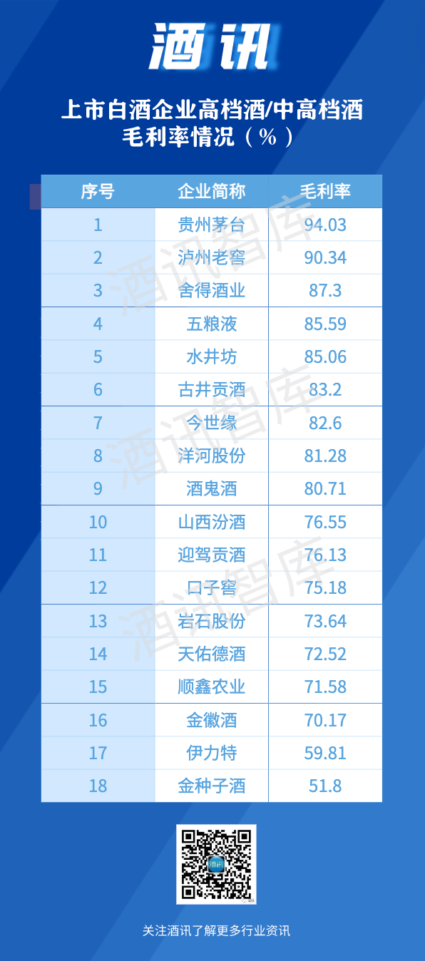 与帝亚吉欧与保乐力加同水平的山西汾酒(76.55%)、迎驾贡酒(76.13%)、口子窖(75.18%)、岩石股份(73.64%)、天佑德酒(72.52%)、顺鑫农业(71.58%)、金徽酒(70.17%)则保持在70%左右,在整个白酒板块属于中下游水平。