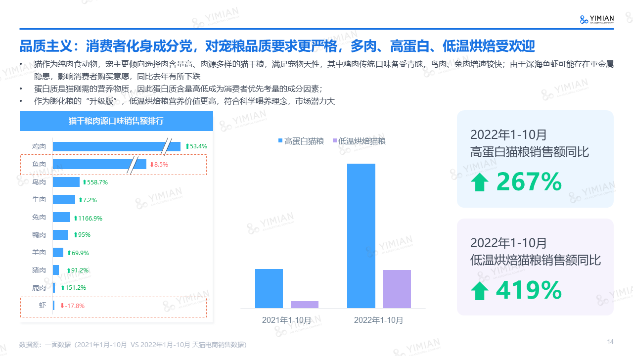 宠物猫数量崛起,带来了空前繁荣的“猫经济”。俗话说“民以食为天”,猫也如此,猫食品具有刚需、高频消费属性,2022年1-10月,猫食品在天猫平台上的增速达18%,是“猫经济”中规模最大的细分品类。