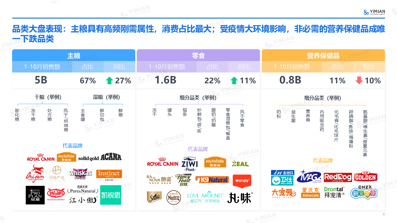 若针对猫食品进一步细分,可分为主粮、零食、营养保健品三大品类。从天猫品类大盘来看,主粮满足宠物猫的生存刚需,是猫食品消费中最基础的品类,占比达到了67%。