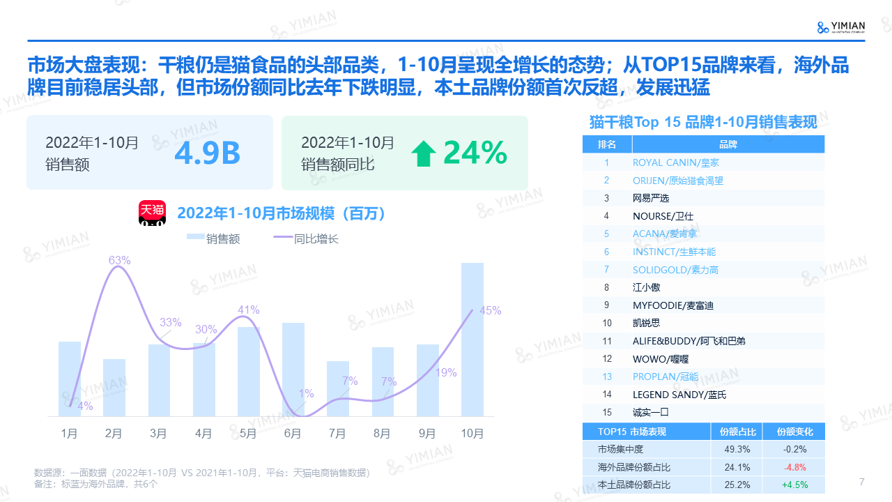 让我们将目光聚焦到干粮上:从天猫大盘来看,干粮仍是猫食品的头部品类,1-10月呈现全增长的态势;从TOP15品牌来看,海外品牌仍占主导,但市场份额同比去年下跌明显,本土品牌份额首次反超。