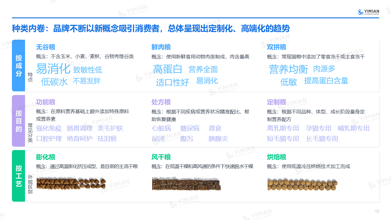 本土宠粮品牌还瞄准了不同的消费需求,推出了多种类、新概念的猫干粮,如含有美毛护肤、肠胃调理等功效的功能粮。在价格上,本土品牌已经不复当年低价,尽管大部分仍处于中低端价格带,但已有部分宠粮价格与高端进口品牌持平,总体呈现出高端化的趋势。