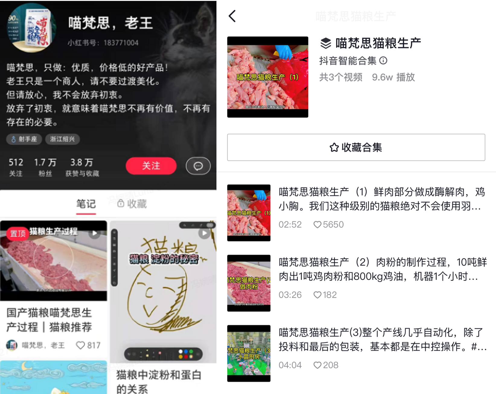 如本土宠粮品牌喵梵思创始人亲自运营抖音、小红书账号,发布视频展示从采购原材料到制作猫粮的各生产环节,以证明产品的安全性。这种操作赢得了一部分消费者的夸奖,也引来了不少消费者的担忧:视频中展示的生产环境也并非完全标准化卫生化,那么其他品牌的宠粮生产会不会更脏乱差?