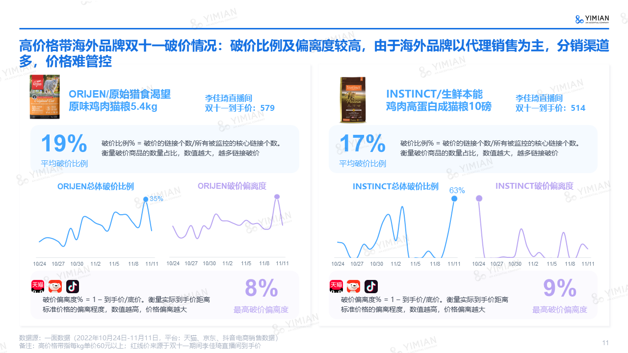首先,代理再经销的模式下品牌的销售渠道众多,难以统一管理销售价格,容易出现破价情况,尤其是双十一等大促活动期间,部分店家会以低价吸引消费者。如渴望和INSTINCT在双十一期间破价比例接近20%,最高破价偏离度接近10%,而国产品牌蓝氏和卫仕最高破价偏离度都不超过3%,卫仕甚至基本没有破价情况。