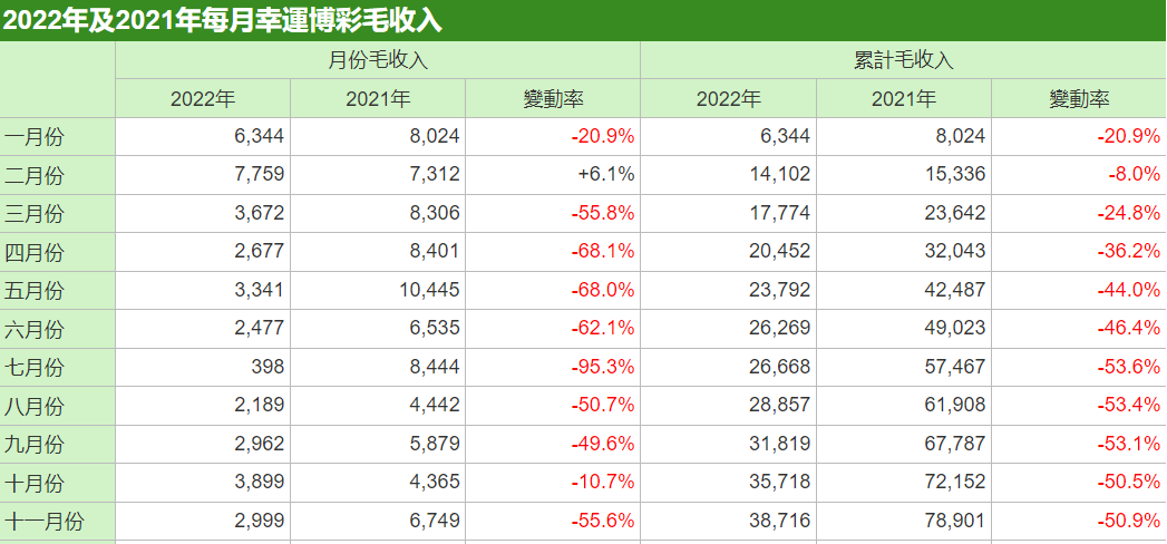 今年前11月,澳门博彩收入尚未见起色。据澳门博彩监察协调局数据,11月澳门幸运博彩毛收入29.99亿澳门元,同比下降55.6%;1-11月幸运博彩毛收入387亿澳门元,同比下降50.9%。跟2021年相比,今年澳门博彩业绩打了五折。