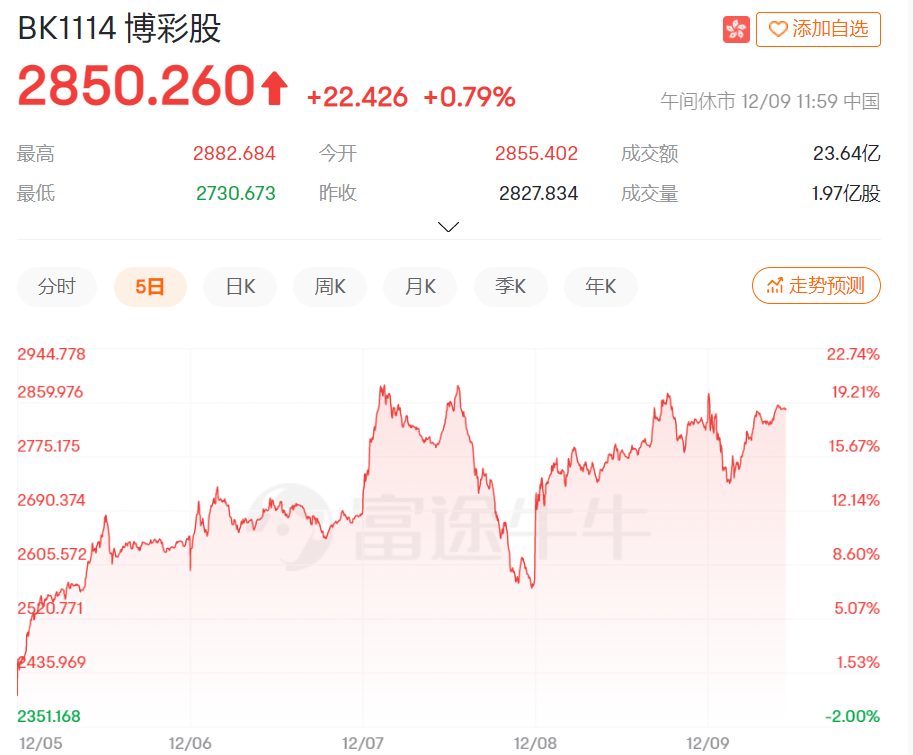 12月6日以来,博彩股持续走强。截至12月9日午时收盘,博彩股涨幅达18.82%。