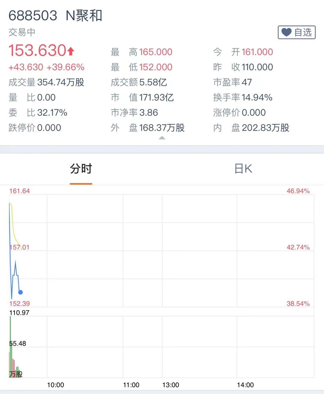 12月9日,常州聚和新材料股份有限公司(以下简称聚和材料)在上交所科创板上市,发行价为110元/股,开盘价为161元/股,开盘价较发行价涨幅达46.36%,市值达181.8亿元。开盘后其股价最高升至165元/股,随后有所下跌,截至9点38分,其股价为153.63元/股,距发行价上涨39.66%,市值173.48亿元。