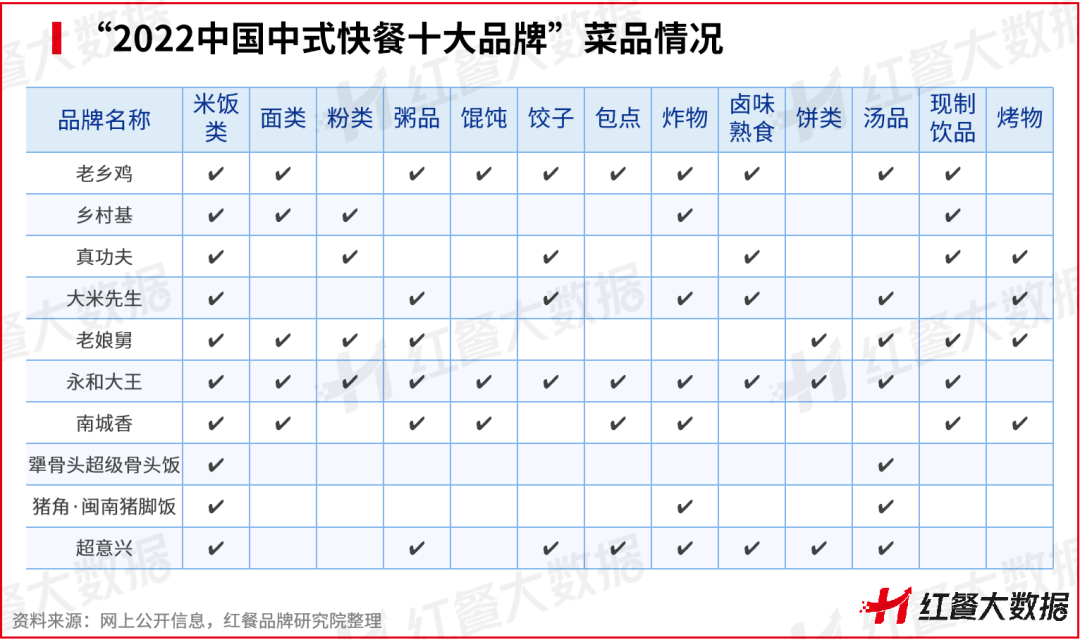 除了不断丰富菜式之外,横向扩充产品种类和多时段运营也是很多品牌的通用做法。红餐品牌研究院统计发现,在“2022中国中式快餐十大品牌”的菜单中,除了面类、粉类、粥品等主食类产品以外,炸物、卤味熟食、饼类、烤物等休闲小吃也是品牌跨品类拓展产品线的热门选项。其中,永和大王、老乡鸡、超意兴的菜品品类覆盖度尤为广泛。