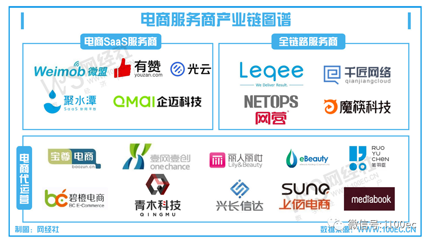 据网经社企业库(COP.100EC.CN)显示,当前,电商服务商产业链中的主流平台包括:电商SaaS服务商类:微盟、有赞、光云科技、聚水潭、企迈科技;全链路服务商:乐其电商、千匠网络、网营科技、魔筷科技等;电商代运营:宝尊电商、壹网壹创、丽人丽妆、悠可、若羽臣、碧橙电商、兴长信达、上佰电商等。