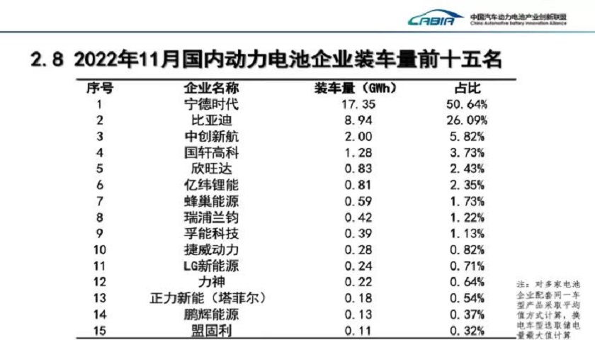 宁德时代11月稳居榜首,装车量达17.35 GWh,市占率为50.6%,环比上升2.8个百分点,时隔七个月再度占据国内一半以上的市场份额,并创年内新高。