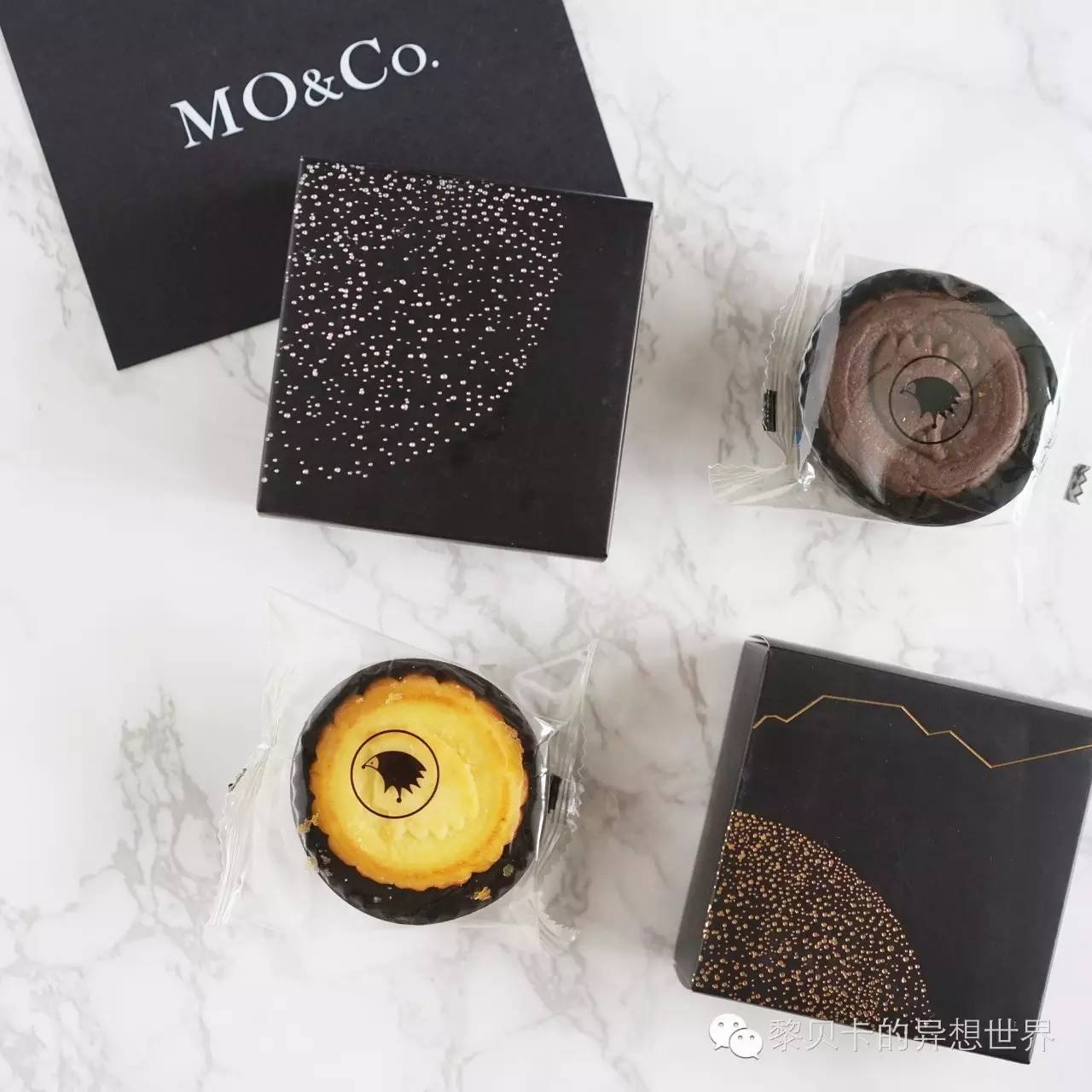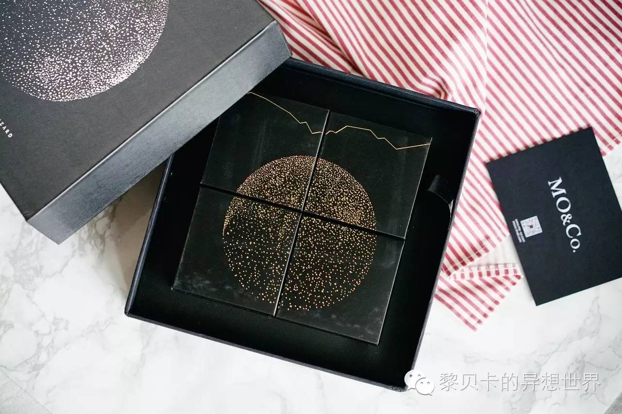 这一盒就更加帅气了,Mo&Co和近几年红起来的甜点品牌黑法师合作,包装整个都是黑色的,盒面是黑法师标志性的烫银点月球,打开则是金色的月球。还蛮精致的。▼
