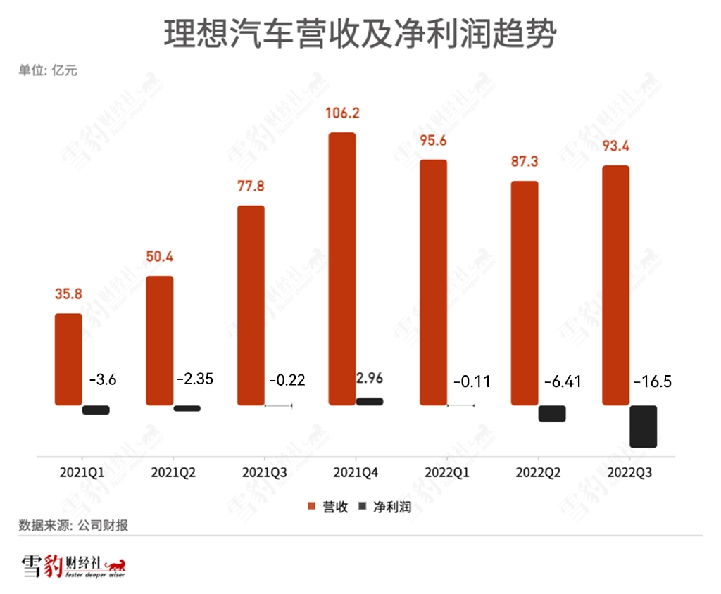12月9日,理想汽车发布2022年Q3业绩:净亏损急剧扩大至16.46亿元(上年同期为亏损2150万元),创下单季亏损新高;市场关心的核心指标毛利率为12.7%,相比去年同期下滑了10.6个百分点。期内,营收和汽车交付量的同比增速亦均低于去年同期水平。