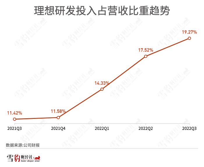以研发投入为例,成本飙升尤为明显:Q3理想研发费用18亿元,同比增长103%,公司解释称,新车型的研发和研发人员的增加推高了此项费用。最近5个季度,理想的研发收入比从11%一路攀升到了近20%。