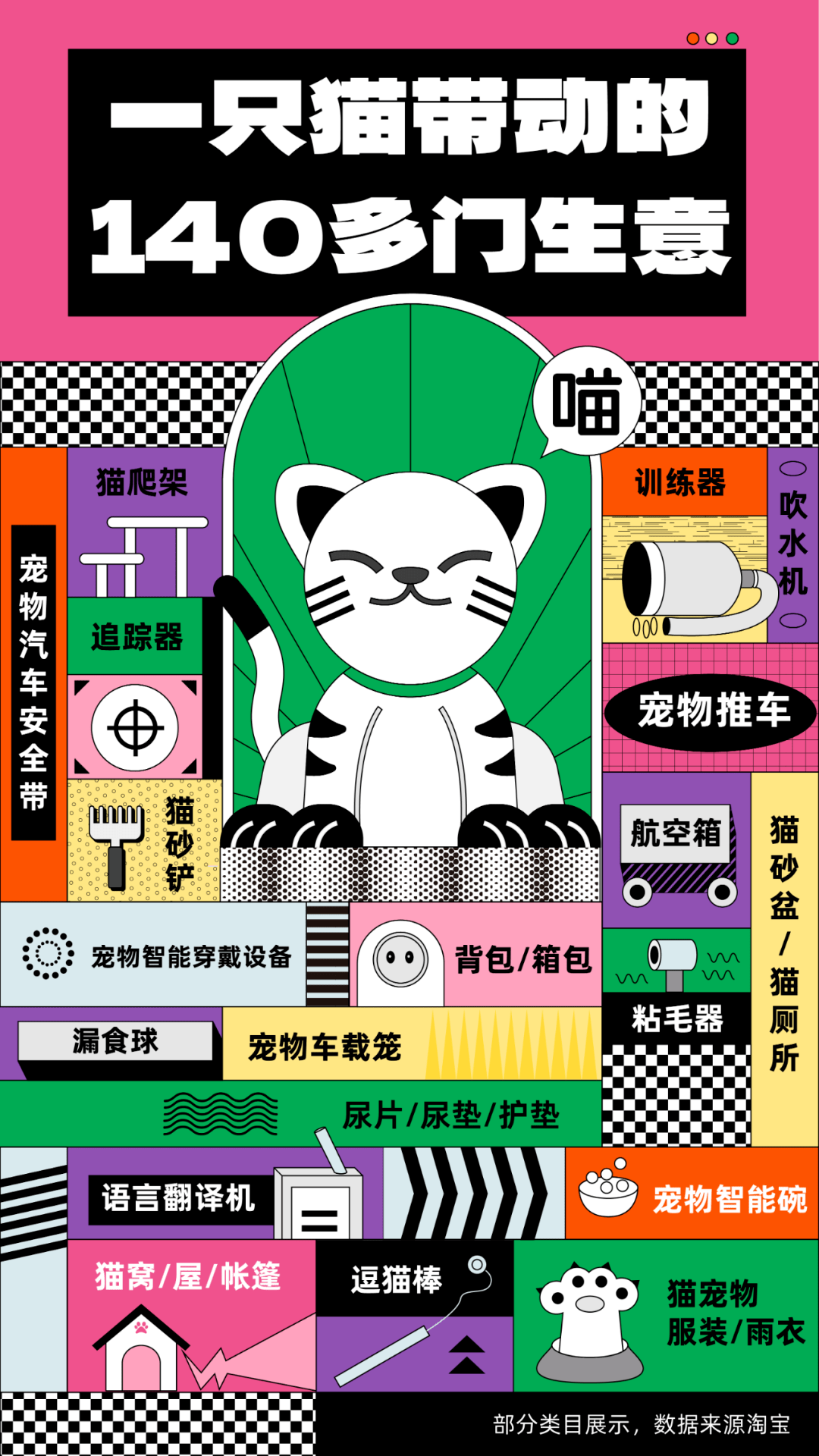 据淘宝数据显示,一只猫咪的养成,起码有140门生意与其息息相关。